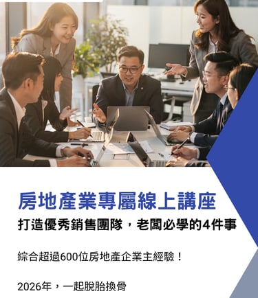 你將在這場分享中學到:1️⃣房地產業新人培訓2️⃣不看業績,也能理解團隊真實狀況的方法3️⃣讓業績不再只靠少數人的管理思維這場講座不教話術、不談技巧,而是從管理者角度,帶你看懂——能長期運作的銷售團隊,必須具備的四個關鍵判斷。